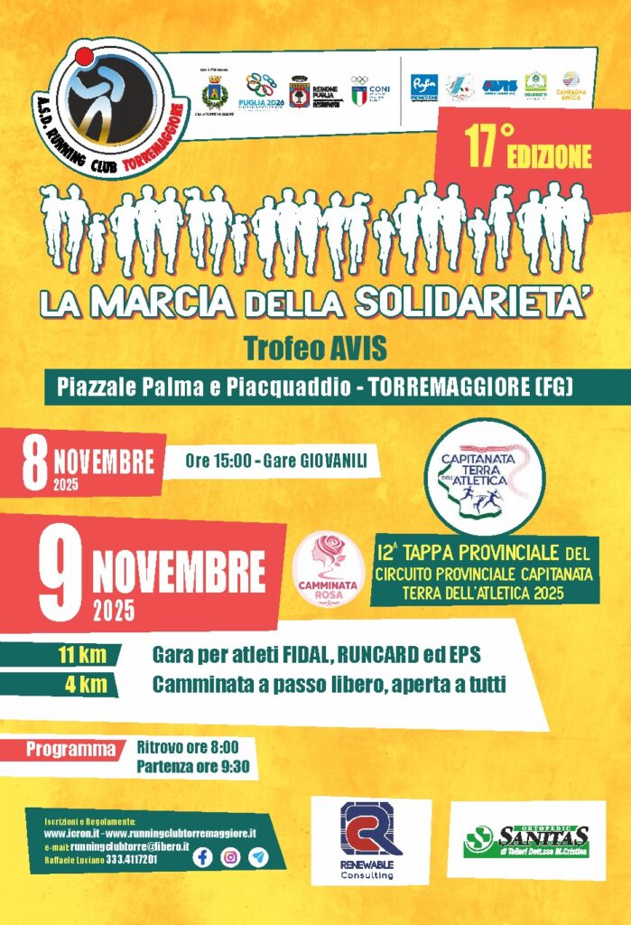 Da un idea dell’Associazione San Cristoforo nasce nel 2007 la gara podistica “Marcia della Solidarietà” che ha la finalità di raccogliere fondi da utilizzare per l’acquisto di generi alimentari per le famiglie bisognose di Torremaggiore, che l’Associazione – aderente alla Fondazione Banco Alimentare – assiste mensilmente. Il percorso che è rimasto invariato negli anni tocca le chiese di Torremaggiore che portano il nome della Madonna (Chiesa del Loreto, Chiesa del Rosario, Chiesa della Fontana per arrivare poi in località Pagliara Vecchia, dove è ubicata la Madonna della Torre) 11 km di cui 6 nel centro abitato e 5 nell’agro di Torremaggiore che danno origine ad un percorso tecnico che mette a dura prova le gambe dei podisti. Alla gara di 11 km si affianca una camminata di 4 chilometri aperta a tutti e 5 gare promozionali per bambini e ragazzi.